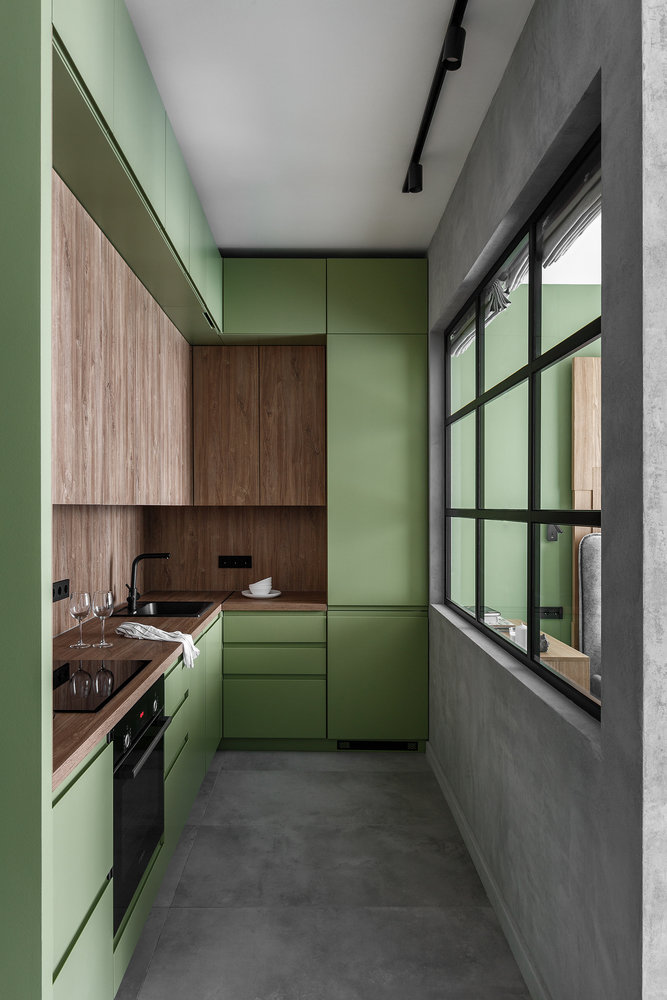 Оснащение кухни: встроенный холодильник с морозильной камерой, электрическая варочная поверхность на четыре конфорки, духовой шкаф с функцией СВЧ, вытяжка, посудомоечная машина шириной 45 см, мойка, смеситель со встроенным фильтром для питьевой воды.