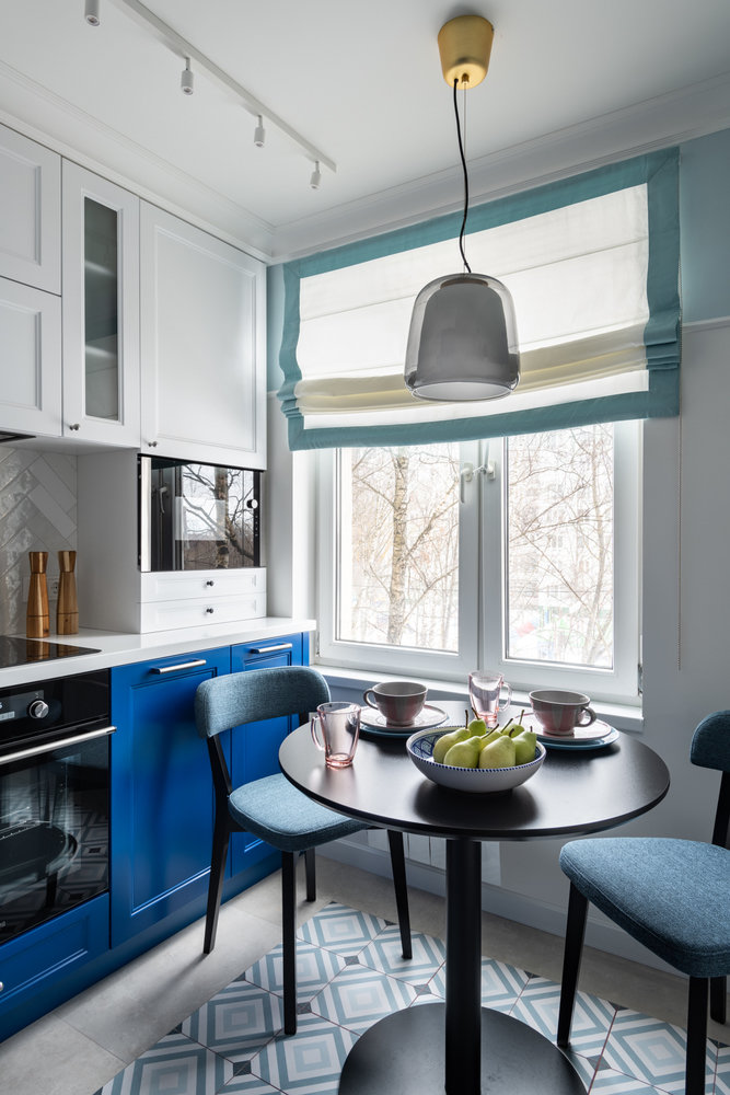 Круглый обеденный стол миниатюрный (80 см) и стоит на одной ноге, что делает его удобным для использования в очень маленьком пространстве. Стулья заказали на INMYROOM.