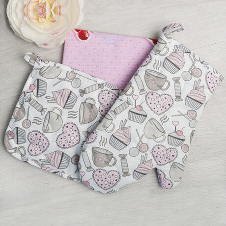 Набор для кухни 'Радушная хозяйка' 3 предмета (рукавичка- прихватка, прихватка, полотенце), 100 % хлопок, 'Французский десерт'